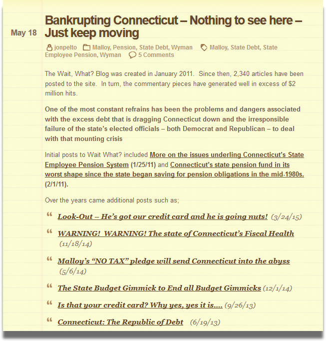 CONNECTICUT:  THE BANKRUPTCY STORY OR NOT - what's new?   And then there is this:  http://ctmirror.org/2016/05/02/malloy-democrats-bring-very-different-perspectives-to-budget-crisis/