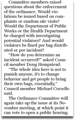 Norwalk HOUR report of Council question below, left. Enforcement easy in Weston Center's few shops and one supermarket.