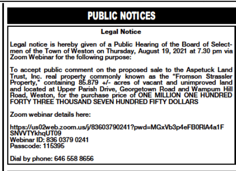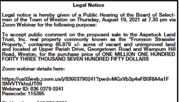 On Sunday August 8th the Public Notice for Public Hearing on sale of Fromson-Strassler to Aspetuck Land Trust.